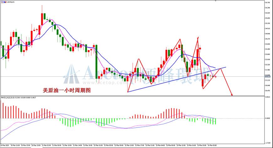 从美原油一小时周期图看,上周五早间多头强力上行至34.20附近后,价格晚间开始快速回落,其后自32.00附近多头快速拉出新高,从上周五多空博弈看,市场做多情绪开始增多,但日内早间受美联储再次突发降息,引发原油早间开盘跳空向下。从走势上看,一小时周期图上,价格在近期低位震荡,目前有逐步走低的态势,头空在逐渐增强。日内交易上,由于下跌较强,建议反弹继续做空。