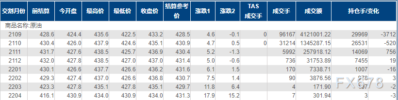 上海原油价格上涨,主力合约2109终盘收于433.2元/桶,涨4.6元/桶,涨幅1.07%。