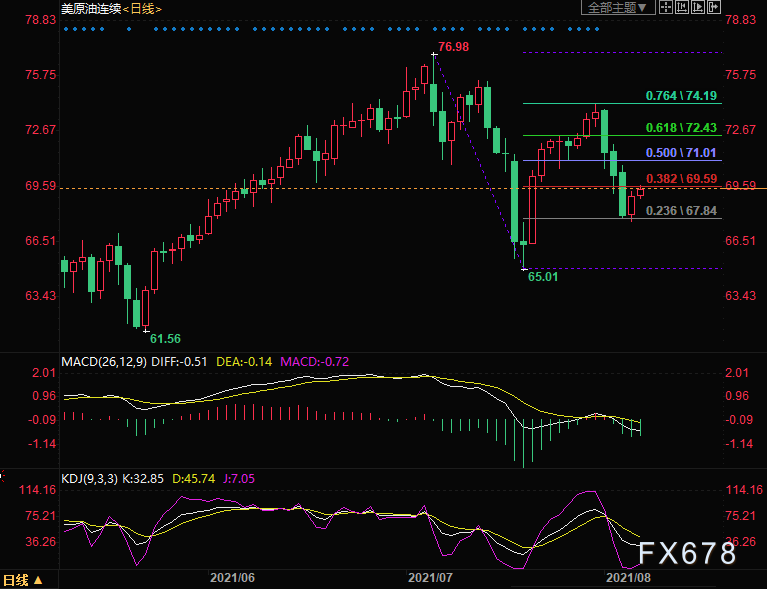 上方初步阻力关注50%回撤位71.01,进一步关注61.8%回撤位72.43以及7月30日高位74.23。