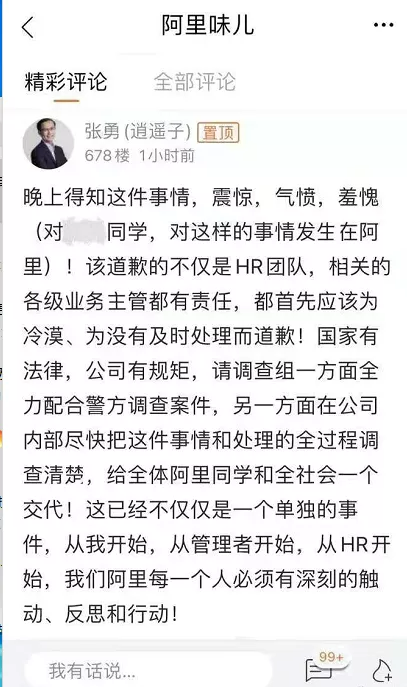 8月8日凌晨,阿里巴巴董事局主席兼CEO张勇在阿里内网发帖回应此事。他用震惊、气愤、羞愧,来表达对阿里一员工涉嫌侵犯女同事事件的感受。张勇认为,该道歉的不仅是HR团队,相关的各级业务主管都有责任,都首先应该为冷漠、为没有及时处理而道歉!
