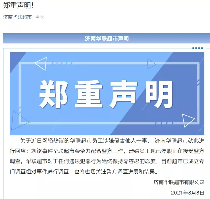 8月8日,济南华联超市也进行了回应:华联超市会全力配合警方工作,涉嫌员工现已停职正在接受警方调查。