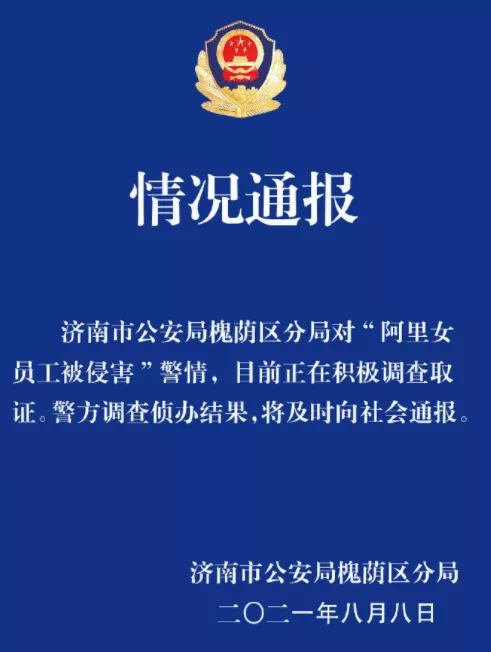 紧接着,8月8日午间,济南市公安局槐荫区分局作出通报称:对“阿里女员工被侵害”警情,目前正在积极调查取证。警方调查侦办结果,将及时向社会通报。