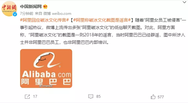 8月8日下午,据中国新闻网报道,随着“阿里女员工被侵害”一事引起热议,微博上流传出多张“阿里破冰文化”的低俗聊天截图。对此,阿里方面称,“阿里破冰文化”的截图是一则2018年的谣言,当时阿里巴巴已经辟谣,图中所涉人士并非阿里巴巴员工,也非阿里巴巴内部培训。