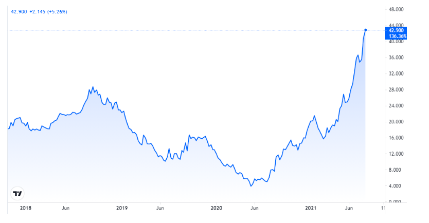 自今年5月以来,天然气价格上涨了逾1000%,也成为了年内涨幅最大的大宗商品。