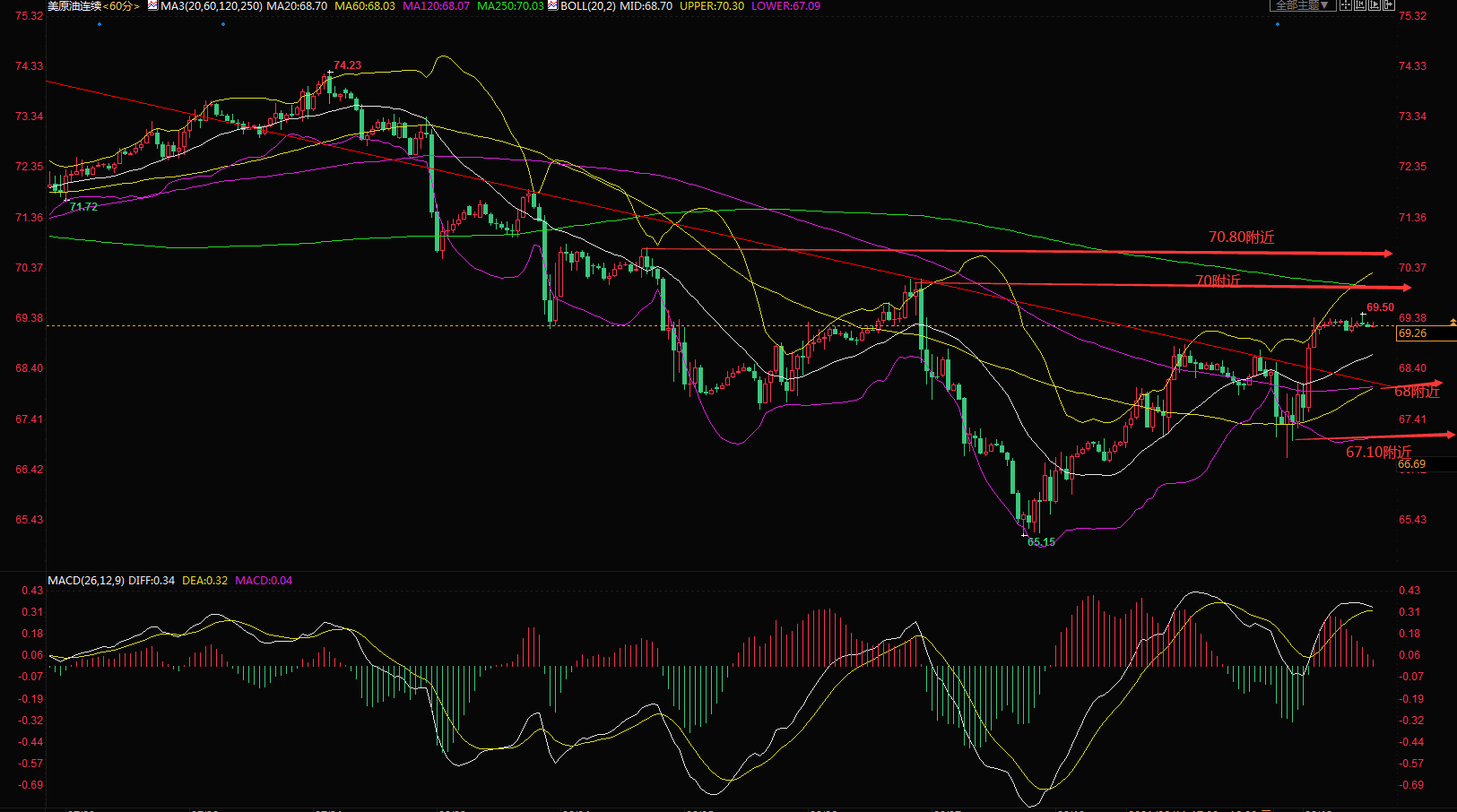 原油操作上依旧是震荡偏多格局,67.10支撑在昨天失而复得,且创出新高69.40,日内操作上还是偏多思路,重点关注68,67.10附近的支撑位,以及70,70.80附近的压力位。