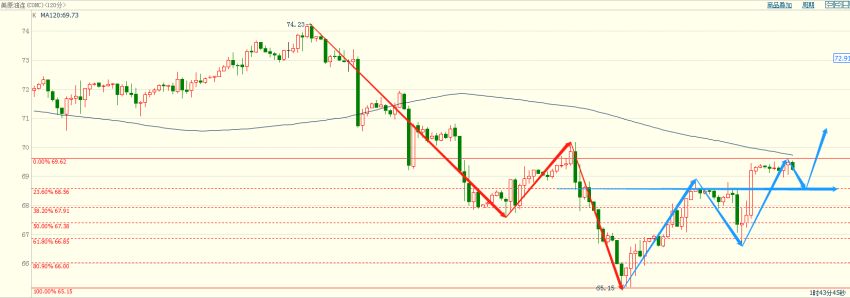 原油近期也在马不停蹄的反弹当中,目前反弹已临近黄金分割50%的位置受阻,日内并没有太大的波动,价格在昨天晚上受制于前期低点的压制产生了滞涨行为,之后进入了窄幅震荡区间,维持了近10多个小时的横盘整理,由于原油反弹的主空间并没有到位,主思路还是以回落做多为主,美盘给出的思路是等待价格回调至黄金分割23.6%的位置68.50一线多单介入,风控点放置68.00下方,目标位看至69.70~70.20。(博易大师报价,图灵波浪理论)图片为原油2小时图