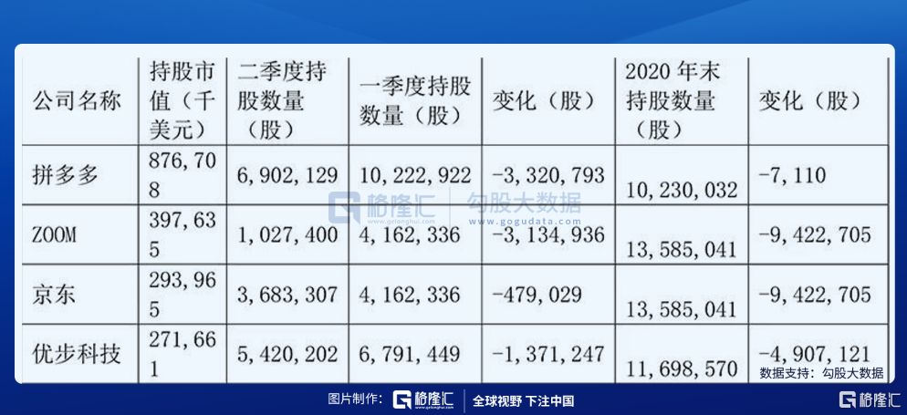 持仓变化方面,拼多多虽然依然是高瓴第二大重仓股,但二季度高瓴大幅度减持拼多多4.5%的股份,是其减持比例最大个股。