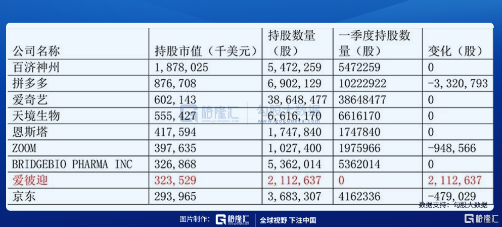 目前,在纳斯达克、港交所、上交所三地上市的新生代医药企业百济神州依然是高瓴的美股第一大重仓股。其余十大重仓股则分别是拼多多、爱奇艺、天境生物、恩斯塔、Zoom、BridgeBio、爱彼迎、京东和赛富时。