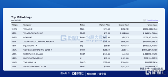 和高瓴思路类似,华尔街当红明星“木头姐”同样看好新能源汽车赛道,特斯拉是旗下基金ARKK(颠覆性创新基金)的最大持仓。此外,ARK的前十大重仓股还包括享受疫情红利的流媒体公司Roku、视频会议ZOOM等。
