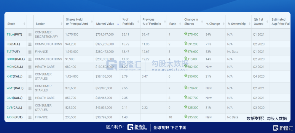在Burry的投资组合中,特斯拉看跌期权占据了35.11%的仓位,Facebook和谷歌的看涨期权则分别列入前五大持仓中的第二、第四位。