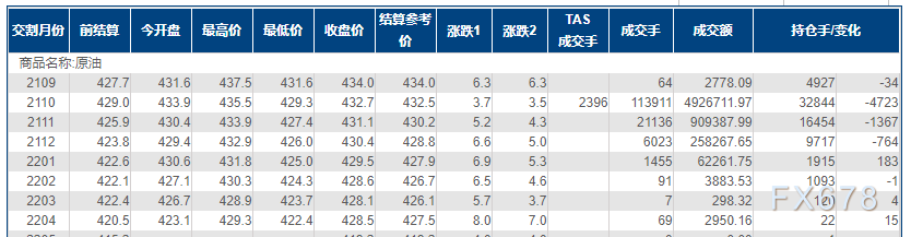 上海原油价格上涨,主力合约2110终盘收于432.7元/桶,涨3.7元/桶,涨幅0.86%。