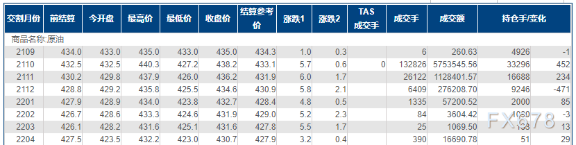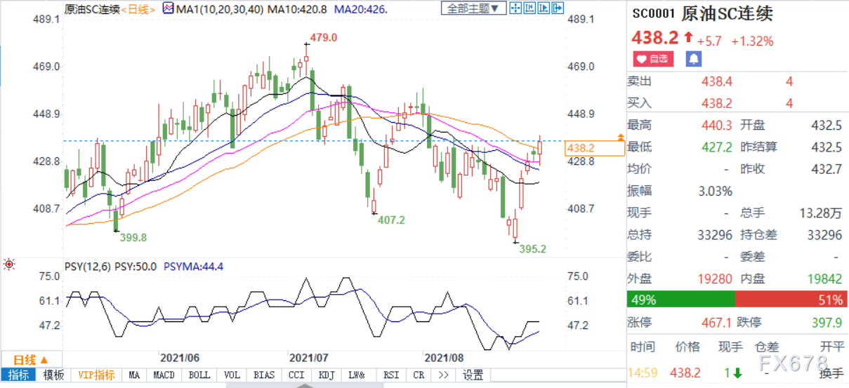 上海原油价格上涨,主力合约2110终盘收于438.2元/桶,涨5.7元/桶,涨幅1.32%。