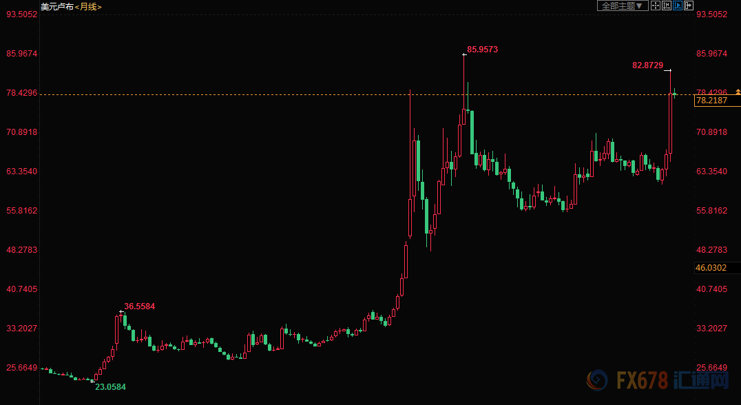 俄罗斯卢布3月跌至逾四年高位,跌幅20%。美元兑卢布最高触及82.8729,仅次于2016年初的水平。而当时因为乌克兰危机,引发了西方对于俄罗斯的普遍制裁,因此卢布大跌。