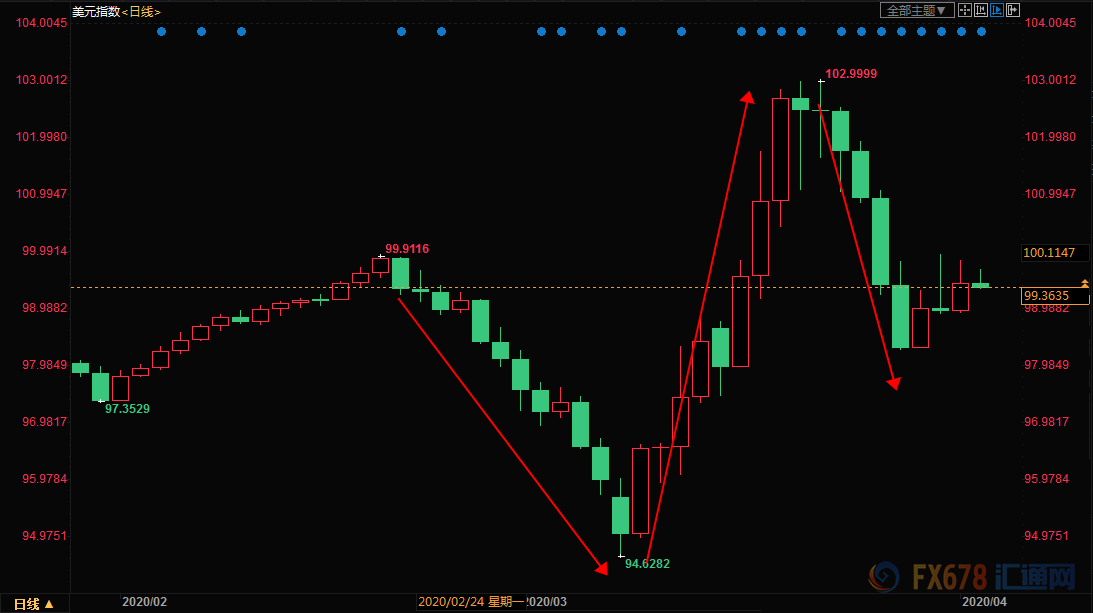 3月美元经历了非常震荡的一个月,在3月3日美联储紧急降息50点,美元随后几个交易日跌至一年半新低,但是市场流动性稀缺,美元开始大幅上涨,3月第三周录得11年最大单周涨幅,最高触及103关口。但是随着各国央行持续向市场注入流动性,美元又刷新11年最大单周下跌。