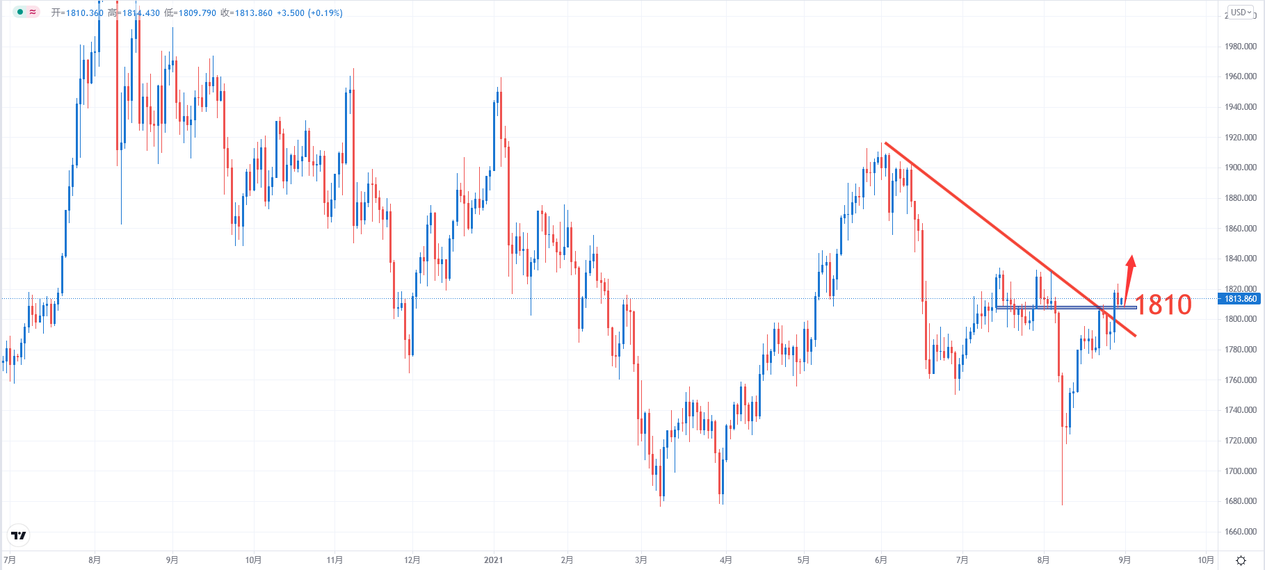 金价周一在触及近四周高位后下滑,现货黄金尾盘收于1810美元附近,稍早曾触及8月4日以来最高水平;美元从低位回升,投资者在本周晚些时候关键美国就业报告发布前态度谨慎。