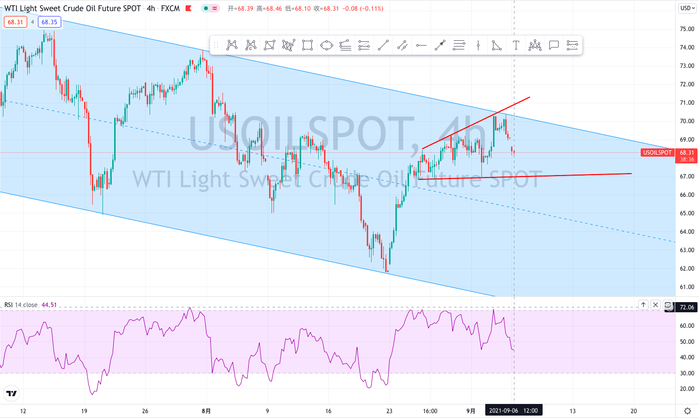 原油四小时级别来看,明显承压于震荡下行通道趋势线压制,同时也存在4小时级别的顶背离形态,因此判断油价还将继续下行,并且缺口似乎都很难会去回补。从RSi指标来看,下方还有较大的下行空间,因此原油市场看涨的投资者只能关注67的位置支撑。
