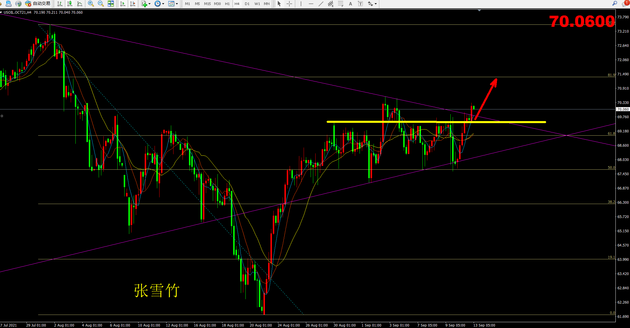 日内原油一路震荡走强,亚盘时间强势上破趋势线69.8压制后,油价便一直在此之上震荡运行,欧盘时间,原油小幅回踩测试下方69.8支撑后,价格再次拉升上涨,而后行情如期上涨破前高刷新至70.7一线。而我们手上持有的69.8多单也是直接获利先出局!
