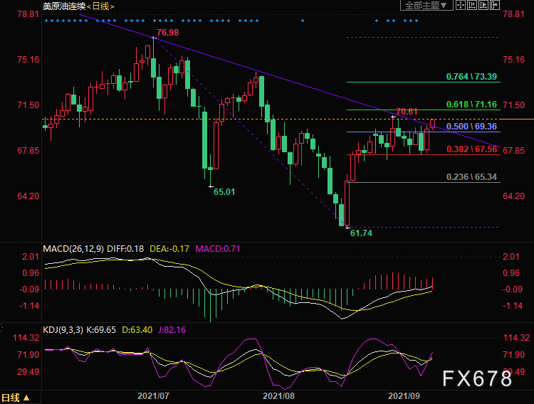 上方初步阻力关注61.8%回撤位71.17,进一步关注8月3日高位71.94及76.4%回撤位73.39。