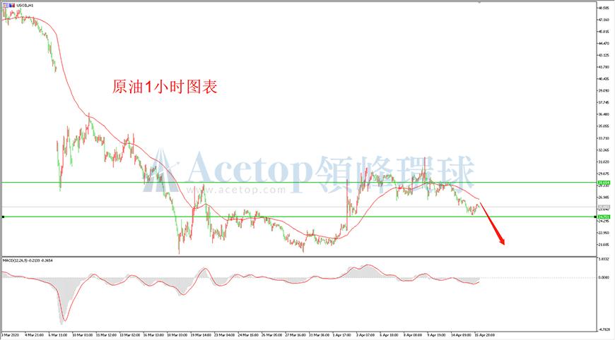美原油昨日走势弱势,价格亚盘小幅回落,欧盘继续回落,美盘时段到达低点25.00附近,日内表现弱势。1小时图上,价格承压EMA60均线,显示出价格的下行走势,目前偏离均线,短周期将走弱。同时,下方的25.00的支撑位效果较好,目前大概率将走调整走势。1小时图上,MACD指标的双线到达0轴下方,能量柱开始缩量,显示出价格的调整需求。目前价格小周期震荡,可以日内反弹后做空,注意控制风险。