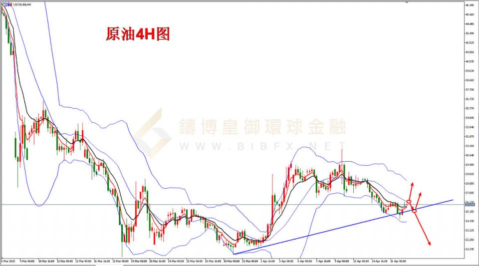 美原油四小时周期,从形态上看,油价在布林带中轨下方运行,但价格在上升趋势线25.00的支撑位获得有效支撑,并反弹至布林带中轨26.20附近,下方MA5、MA10均线即将金叉,表明短线存在多空转换的可能,一旦价格上破26.20,油价将由空转多,原则上,上破26.20以后,油价向上测试31.70的前高压力的概率变大,但若油价在26.20位置受阻,并再次下破25.00的支撑,则将有望重新回到21.00下方;操作上,今日可以在26.20位置做多原油。