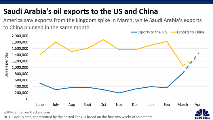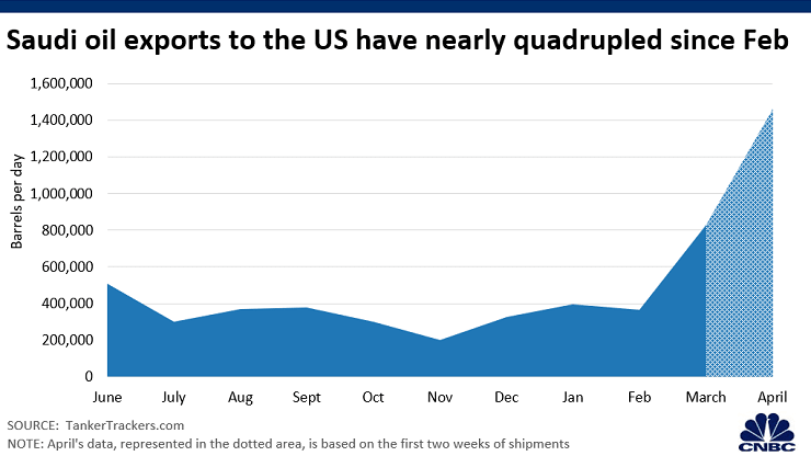 分析公司TankerTrackers.com的数据显示,在油价暴跌、新冠疫情导致全球需求锐减的背景下,沙特对美国的石油出口在3月份增加了一倍以上。