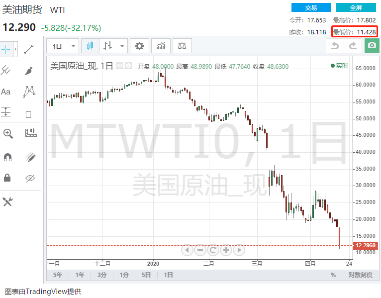 周一欧市盘中,美国WTI原油期货延续暴跌的势头:截止发稿,据路透报价,WTI 5月原油期货价格日内已经跌破12美元/桶关口,最低11.428美元/桶,刷新1999年3月以来低位,跌幅37%,为至少1982年以来最大的单日跌幅。。WTI 原油6月期货跌幅夜扩大至逾10%。 值得注意的是,WTI原油5月期货较6月期货溢价达到2008年以来最大。