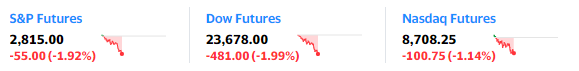 美国股市方面,美国股指期货悉数下挫,道指期货跌幅接近500点;标普500指数期货和纳斯达克指数期货分别下跌1.92%和1.14%。