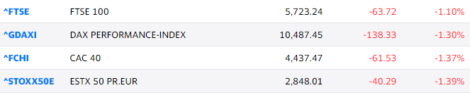 在油价疯狂暴跌之际,全球股市也遭遇了抛压:欧洲股市主要股指跌幅扩大,德国DAX指数跌幅扩大至1.33%,法国CAC40指数跌1.34%,欧洲斯托克50指数跌1.36%,英国富时100指数跌0.97%。