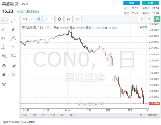 周二(4月21日)欧市早盘,油价又暴跌了:在此前一度涨近10%之后,路透报价,WTI原油6月期货合约跌破17美元,日内跌幅超16%,布伦特原油期货日内跌幅超20%……