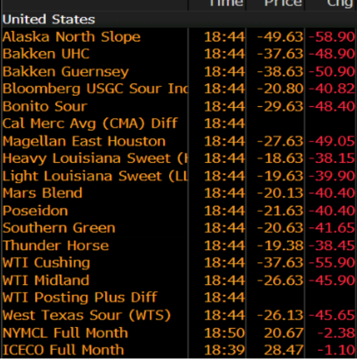 除了WTI原油期货以外,昨夜几乎所有的美国实物原油交割价格,不论地点和品种均进入负值区域。