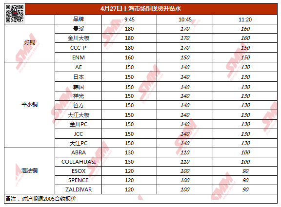 【SMM价格】4月27日上海市场铜现货升贴水(第三时段)