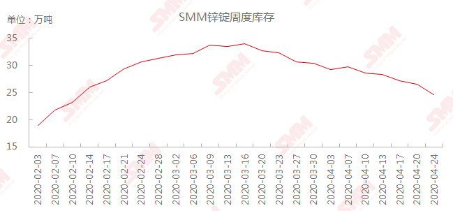 库存方面,自3月16日以来,锌锭库存持续下降,据SMM调研,截至4月27日,SMM七地锌锭库存总量为23.75万吨,较4月20日下降28100吨。虽然整体来看库存降幅较大,但实质上更偏向于库存的转移。广东地区货源发往华东及华北地区,此外湖南地区部分合金厂也从广东拉货,目前部分货源仍然在途,预计在本周内到达其他地方仓库或者下游企业。由于原油下跌带动运费优惠,以及高速公路即将重启收费,预计拉货行为或会有一定持续的态势。
