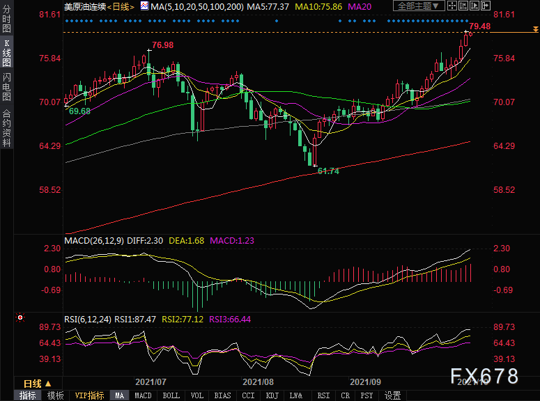 技术面油价单边上涨,均线多头排列,与此同时,RSI显示超买信号,可能限制油价的上涨空间。建议投资者继续低位做多。