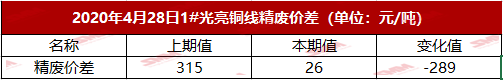 【SMM 数据】2020年4月28日1#光亮铜线精废价差