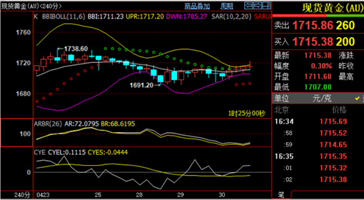 昨日黄金整体震荡上行,亚盘上涨至1713一线后承压,欧美盘延续震荡下跌至1697一线后止跌反弹,依托1700关口震荡上涨至1717一线,日线上收带下影线阳线。铭`诚从技术面来看,黄金强势突破昨日1712日线压制点,经过多次回踩修复确认后的拉伸,布林带中轨于昨日1696上移至1701,低点抬高也助力破日内新的高点,日线整体来看偏多对待。4小时盘面分析,金价从布林带下轨突破来到中轨上方,布林带指标微微缩口,附图指标KDJ结金叉三线向上处于高位超买,MACD指标红色量柱持续放量,快慢线在0轴集结运行。短线依托中轨支撑优先看涨,日内重点关注1724上轨阻力的防守情况,四月月线收官之际,不排除延续昨日的宽幅拉锯震荡行情重现。今日行情上方关注1724-1735阻力,下方关注1712-1701支撑,操作上刘铭诚建议低多为主。实时策略等待临盘提示。