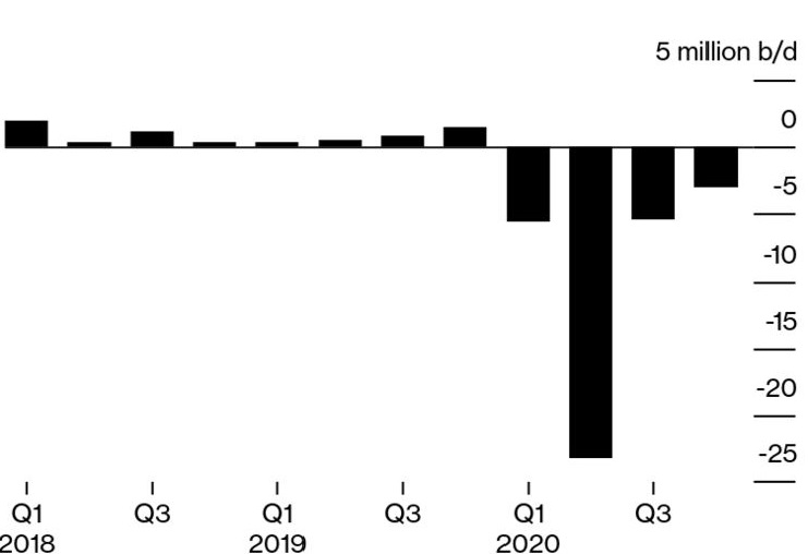 如下图所示,2020年全球原油需求跌幅料创下历史记录