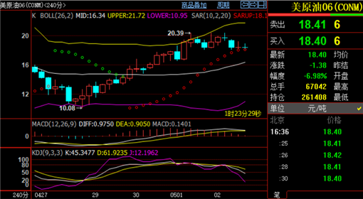 上周因OPEC 产油国陆续减产,加上此前油价已经明显超跌,美原油连续四个交易日上涨,且一度收回20美元关口,周线录得四周以来首次上涨。周一(5月4日)美原油小幅跳空低开,盘中最低触及18美元关口附近,跌幅8.5%。现报18.61美元,跌幅5.92%。从技术面来看,原油日K线四连阳后首次收阴线,行情走预期承压下跌,周末分析给出的21.3区域压制有效,日线上主高空执行交易计划。4小时盘面来看,今日整体波幅不大,油价围绕布林带中轨上方来回拉扯,目前MA5MA10均线位于19.2-3区域承压,附图指标上MACD红色能量柱减弱,快慢线即将结死叉,KDJ随机指标死叉三线看跌,SAR指标延续空头放量,晚间大几率反弹再走空。综合来看原油当前维持18.0-19.3小区间高沽低渣,上方关注20.3-21.3阻力,下方关注17.8-16.6支撑,操作上刘铭诚建议反弹做空为主。