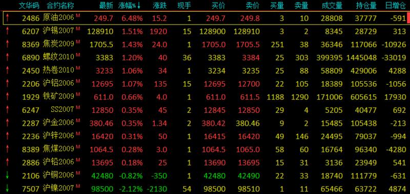 截止9时30分,金属及原油市场合约情况: