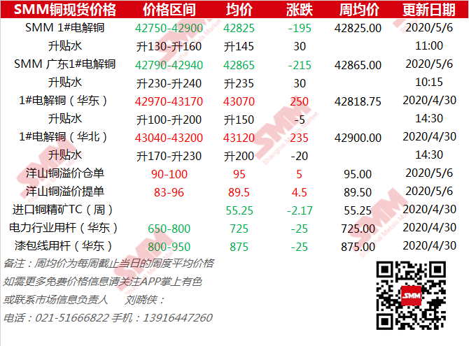 5月6日SMM铜现货价格:SMM1#电解铜均价下跌195元/吨