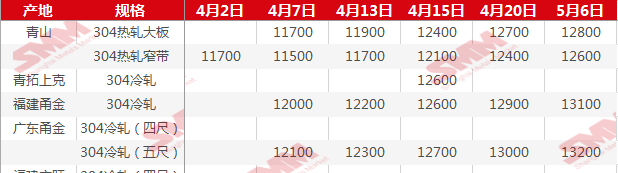 SMM5月6日讯:今日,上期所不锈钢合约自开盘一路走强,大幅拉涨,主力合约SS2007持仓量增4338手至4.4万手,涨幅近3%,突破5/10 日均线位探高13200元/吨。现货市场,钢厂6月份新盘价报出,甬金304冷轧四尺与五尺盘价均较4月20日价格上调200元/吨,304四尺报13100元/吨,304五尺报13200元/吨。随后,贸易商报价跟涨,市场报价普遍上调100元/吨。304热轧窄带盘价上调200元/吨,报12600元/吨,热轧大板上调100元/吨,报12800元/吨,市场报价纷纷上调。涨幅100元/吨左右。