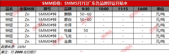 5月7日0#锌广东各品牌升贴水