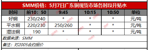 【SMM价格】5月7日广东铜现货市场各时段升贴水(第一时段)