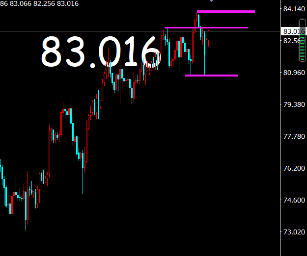 原油周三大区间剧烈震荡,自84受阻下跌于80.76,美盘反弹于82.7,最终收于82.6,日线收阴,近几天不管上涨还是大跌波动都是非常激烈,84是否是该阶段的顶,还需进一步验证,回调修复是肯定会有,主要看修复区间,从日线看MACD红色能量柱减量,上涨动能减弱,下破80油价方能进一步下跌,大趋势,看多不追多,四小时线布林轨平行呈84-80.7区间震荡,现油价处于布林中轨中,可上可下的尴尬位置,小时线布林口向下,油价受阻于中轨下方,偏空,上方关注83压力,鉴于近两天处于大区间运行,操作需谨慎,日内先看84-80区间,以震荡为主