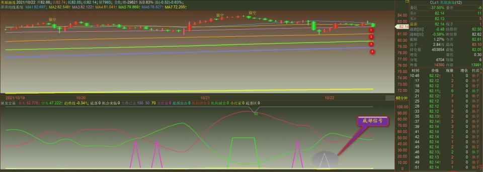 如下图所示:通过对原油小时图解析得知,昨日行情在冲高回落,主力洗盘比较凶悍,晚间在下方80.80一线得到支撑反弹上涨,下方附图显示在80.80一线出现了底部信号,昨天晚间打到了主力近期的进仓位,下半夜再次反弹到83.00一线,目前回调至下方1号支撑位,整体均线系统依然保持多头排列,我们重点关注下方2,3,4号均线支撑位,在操作上我们继续重点逢低做多即可,具体建议如下,此建议仅供参考,仅代表个人观点。