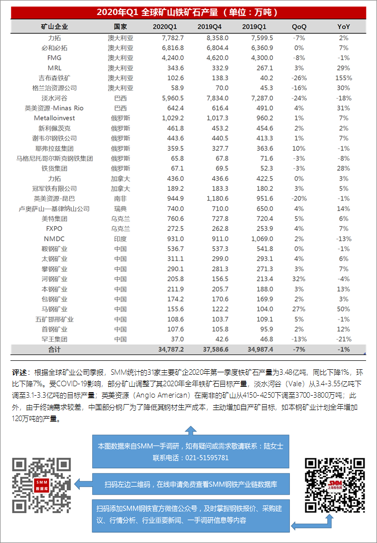 2020 Q1全球矿山铁矿石产量