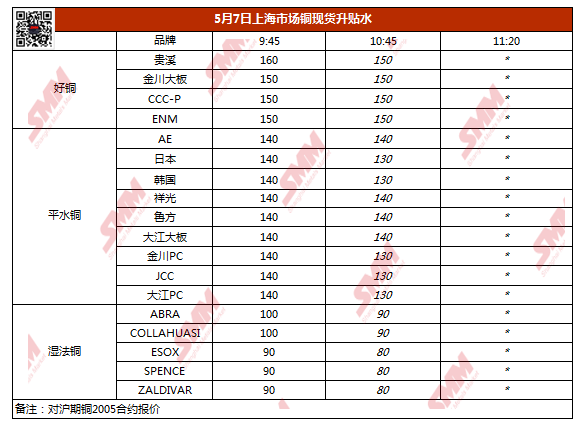 【SMM价格】5月7日上海市场铜现货升贴水(第二时段)