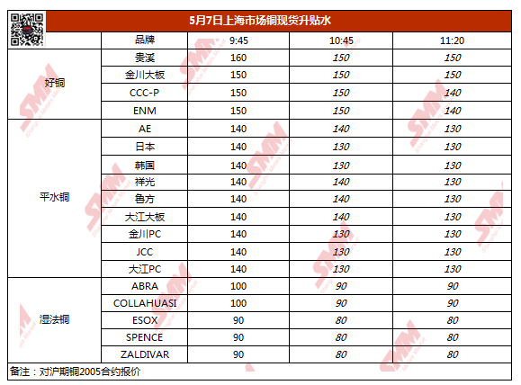 【SMM价格】5月7日上海市场铜现货升贴水(第三时段)