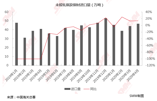 海外疫情蔓延促使全球炼厂增加对中国电解铜的出口,预计5月份电解铜进口量环比仍将继续回升,由于未锻轧铜及铜材中70%为电解铜,预计5月未锻轧铜及铜材进口量也将有所回升。