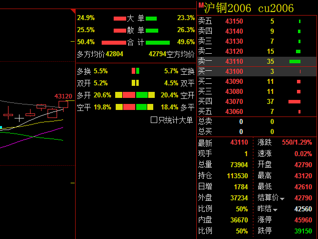 今日沪期铜站上43000元/吨关口,主因今日我国4月贸易帐远超预期,出口意外大幅增长,另外,海关总署下午公布了中国4月未锻轧铜及铜材进口数据以及铜矿砂及其精矿进口数据,环比与同比均录得增长。超预期的进出口数据加强了市场对于我国经济持续好转的乐观预期,在铜供应紧张局面未有缓解的背景下,铜需求持续复苏支撑铜价上行。今日沪铜主力早间开于42730元/吨,开盘后盘面小幅上扬至42820元/吨,随后空头陆续入场叠加多头减仓,铜价震荡下行至日内最低点42670元/吨。此时短空逢低离场带动铜价反弹,收回日内全部跌幅,再次上探42820元/吨。午盘收盘前铜价小幅回落收于42760元/吨。午后开盘,连续的空头减仓操作一路推高铜价。临近尾盘,铜价迅速拉涨直破43000元/吨关口,最终收于43110元/吨,涨550元/吨,涨幅1.29%。沪铜指数日内增仓4390手至34.1万手,成交量增加18829手至16.8万手。