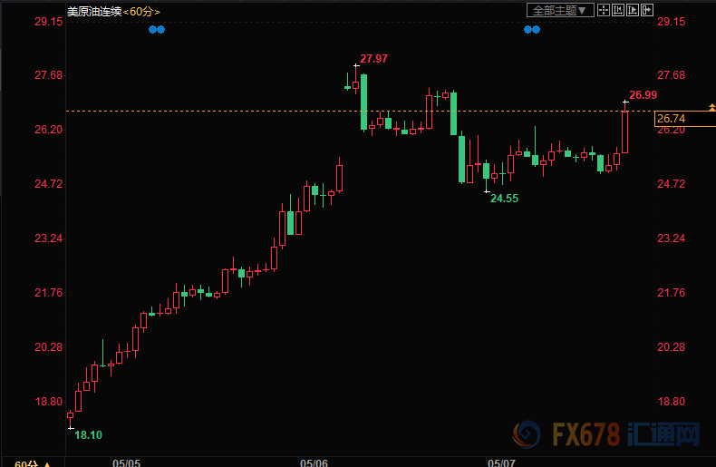 周四(5月7日)美原油在欧盘时段结束盘整的走势小幅走高,现报26.74美元,涨幅4.37%。